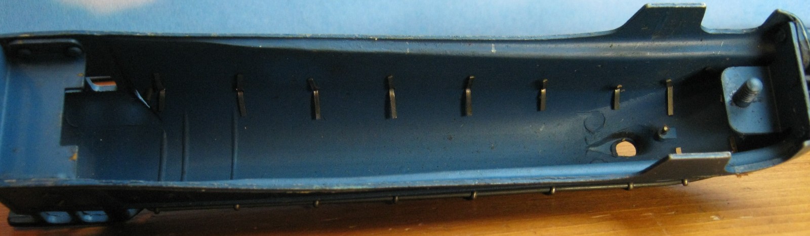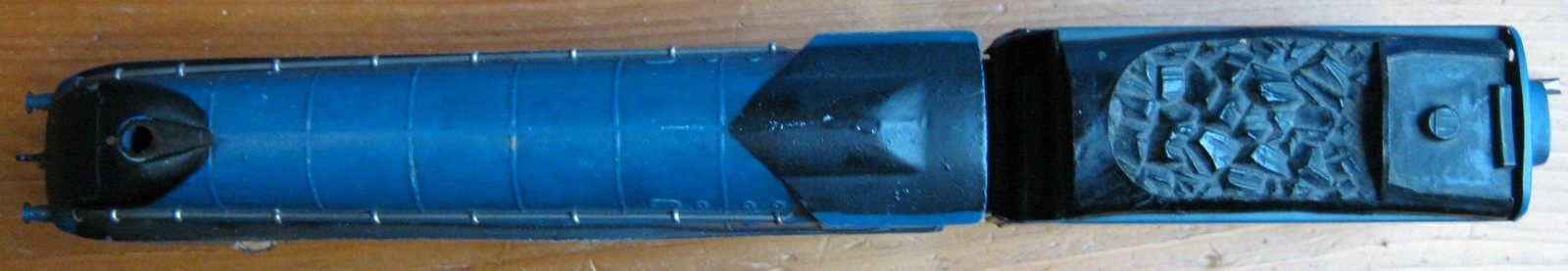 A view of the top of the locomotive, and right, a view of the diecast body from the inside, showing the fixing split-pins for the outer railings.