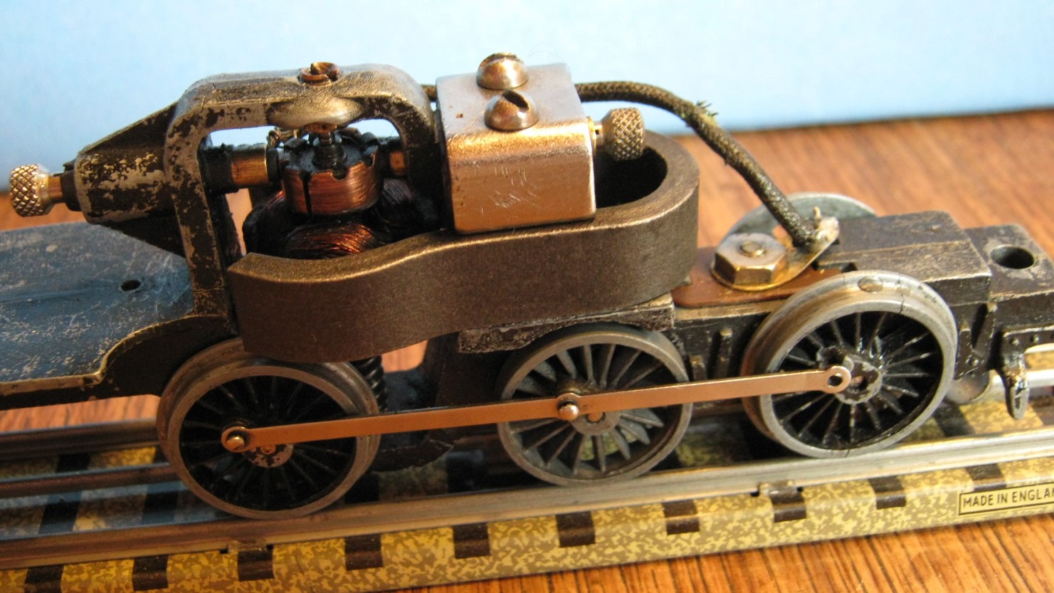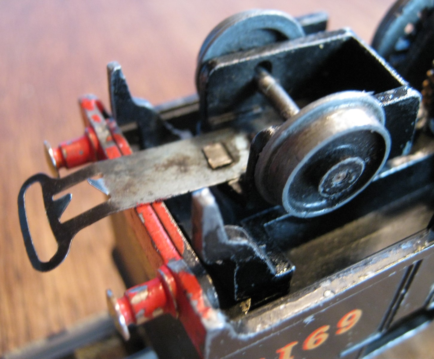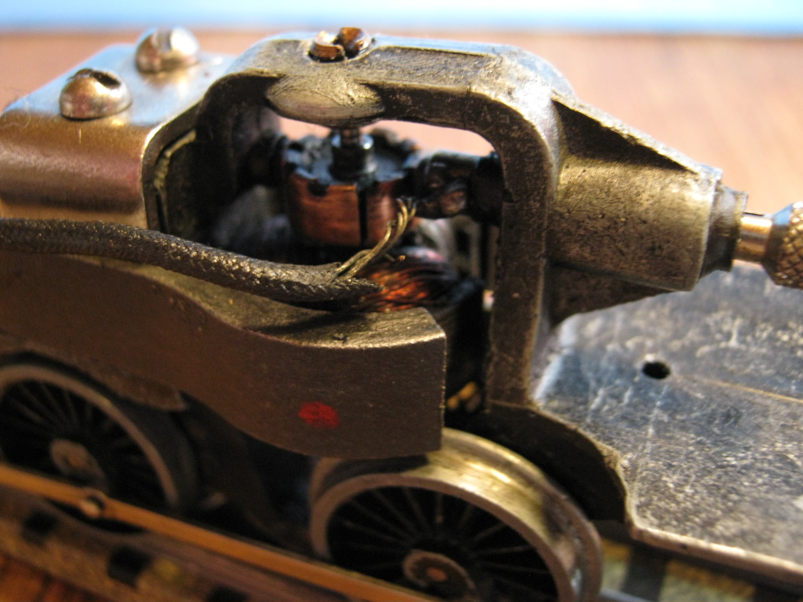 No detailed view of the locomotive would be complete without a look at the motor. Here can be seen the horseshoe magnet I have not replaced the wiring as it still seems to function and I would like to keep the locomotive as original as possible. In a few places the locomotive diecast parts have started to crumble a little, so I try not to handle it too much. This article has been its moment of fame.