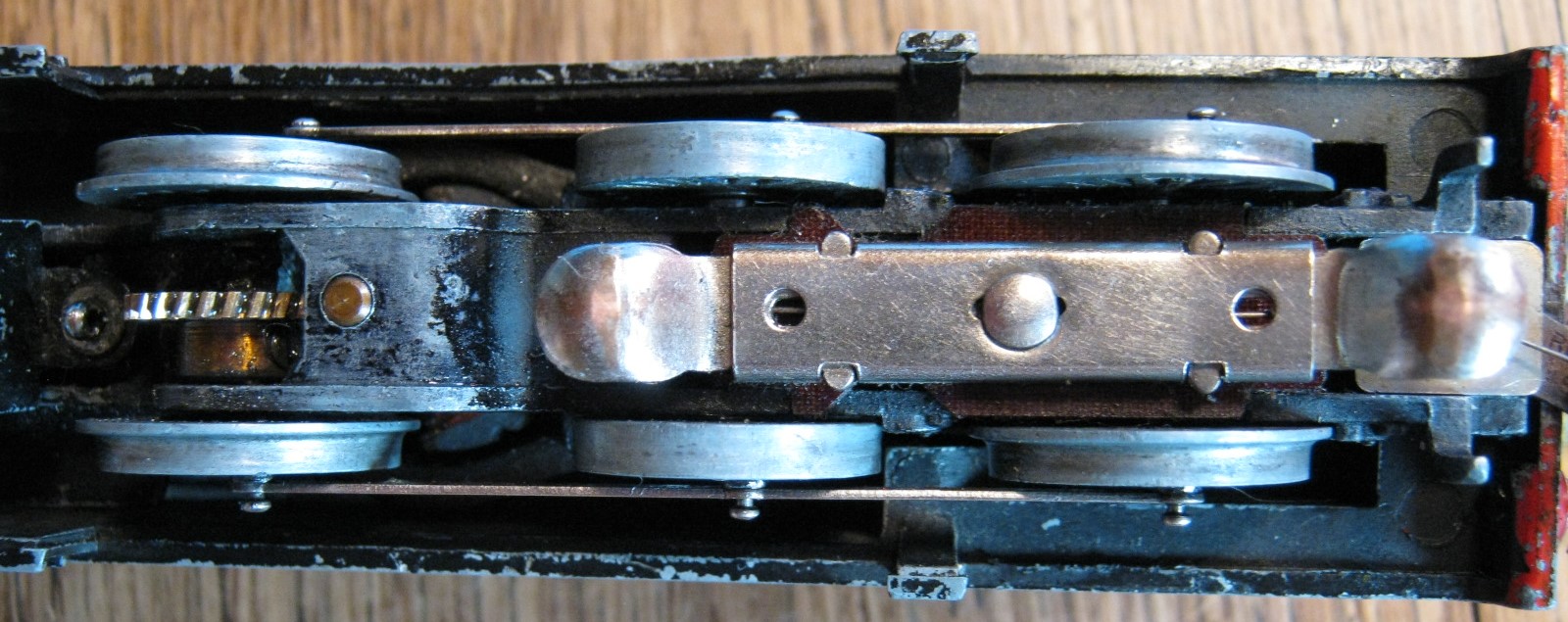 Left of the drive cog, the head of the split pin for the trailing wheels can be seen. The pick up shoe with the two spring loaded spoons are no different from the post-war type.
