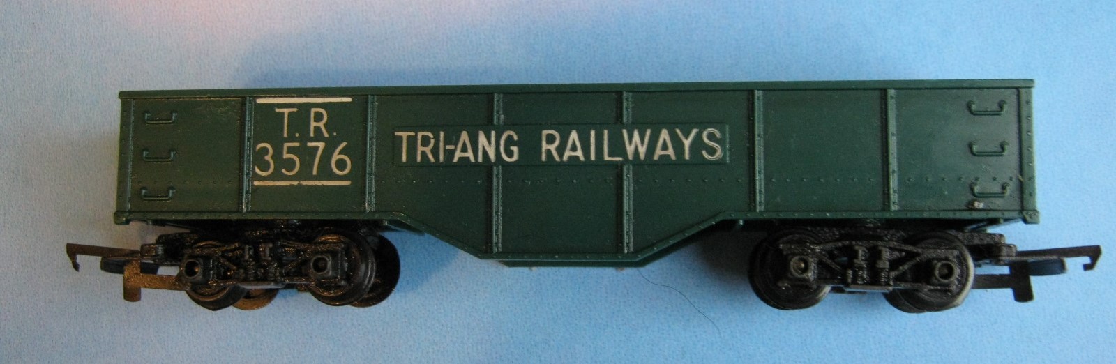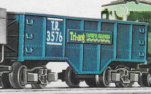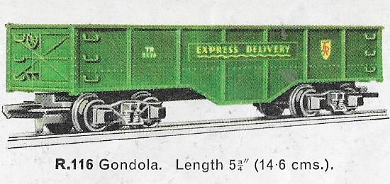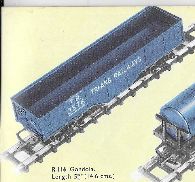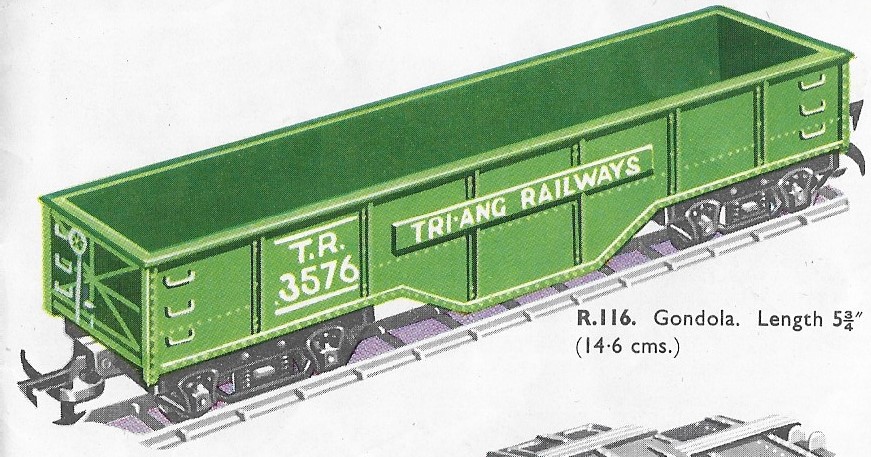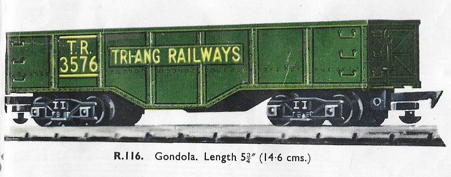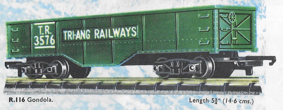 The R116 Gondola was another of the early Transcontinental series, first released in 1954. The 1963 date is the last time it was illustrated in the UK catalogue, however, it remained on sale for a couple of years longer. It remained in the Canadian market into the early 1970s where it carried the "Rock Island Lines" livery. A large number of the stock in Canada were returned to the UK in 1980 and were resold as "Zodiac Models" in 1981.